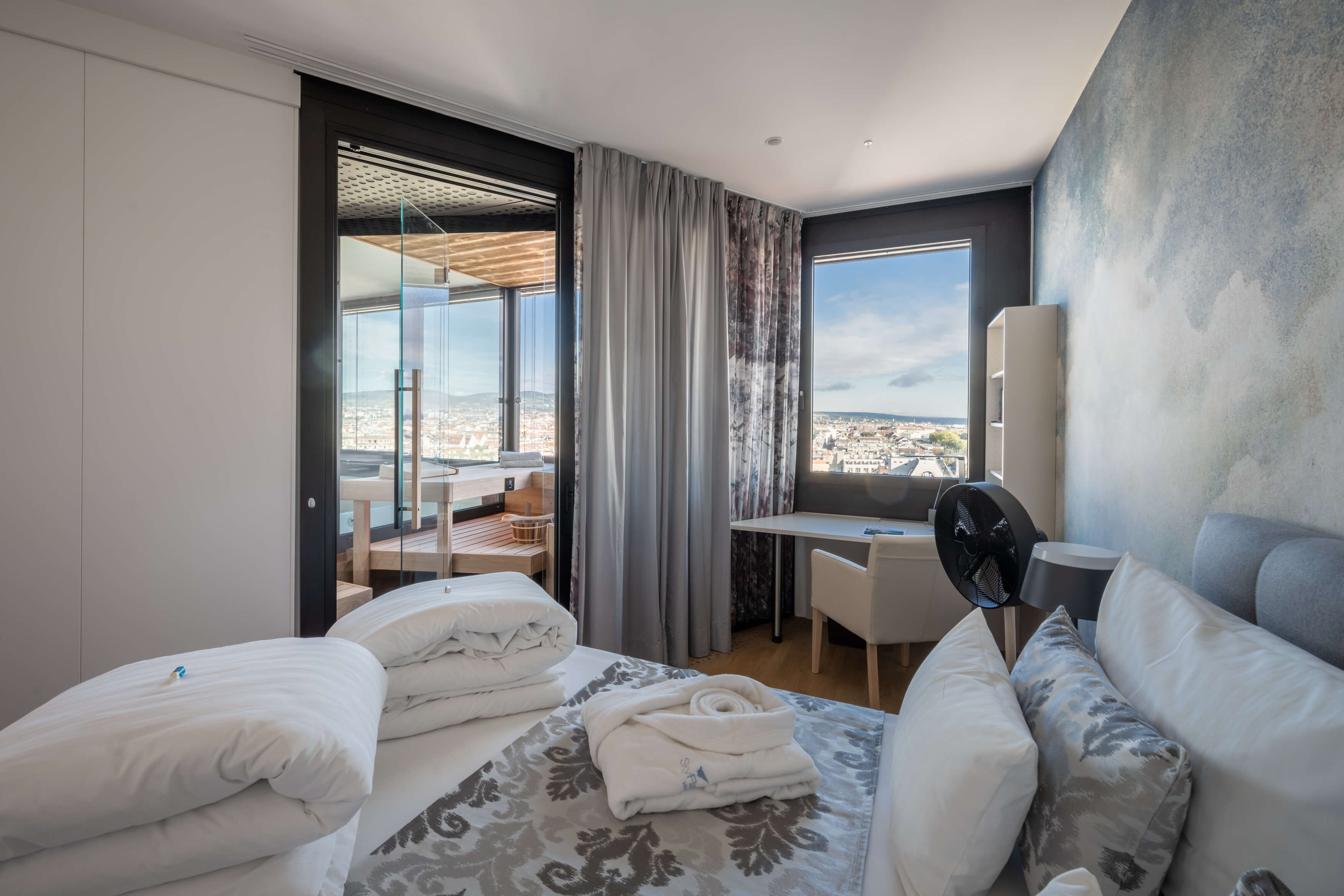Panorama-Sauna, Außen-Whirlpool und Liegeflächen